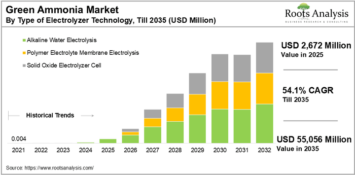 Global green ammonia market size is expected to grow from USD 701 million in 2024 to USD 2,672 million in 2025 and USD 55,056 million by 2032, at CAGR of 54.1%